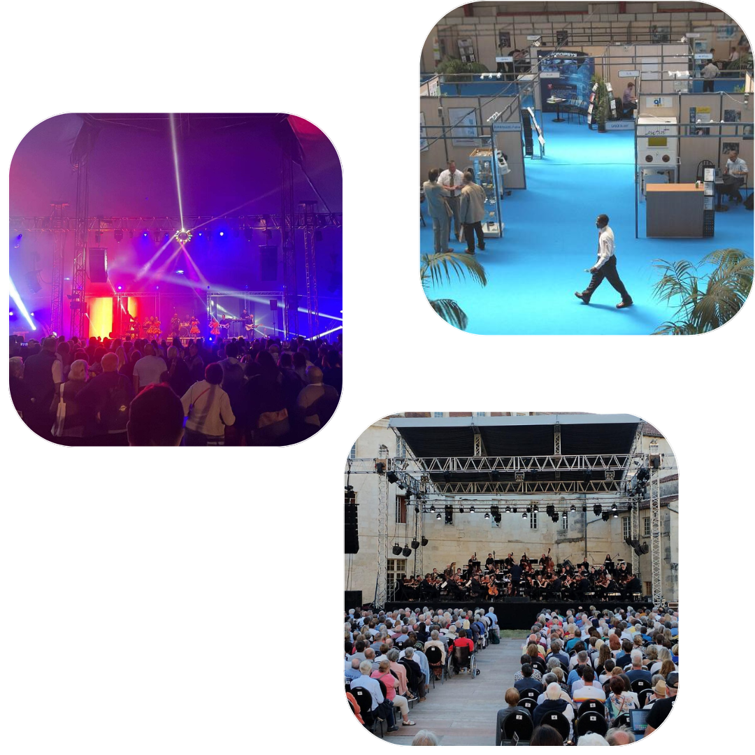 - La location : mise à disposition de matériel de spectacle complet de haute technologie et d'une performance unique : scène, podium, éclairage, sonorisation, décoration